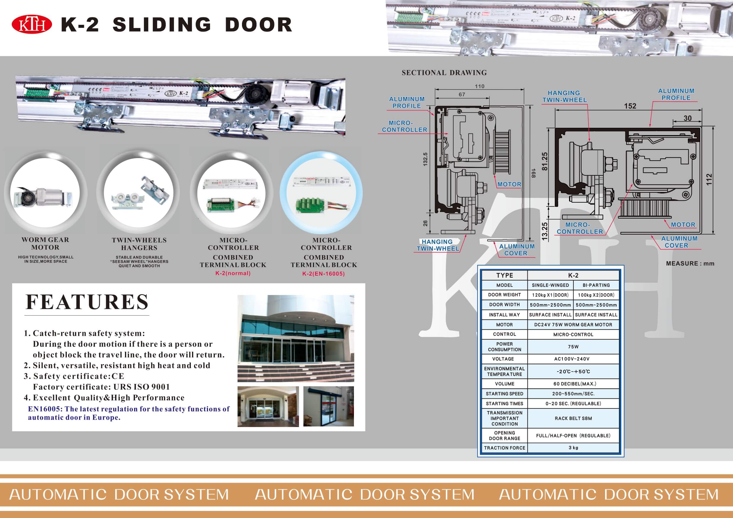 KING TA HAN ( KTH) là thương hiệu đến từ Đài Loan nhà sản xuất thiết bị tự động dàn đầu tại Đài Loan kinh nghiêm 25 năm qua cung cấp sản phẩm chất lượng vượt trội theo tiêu chuẩn Châu Âu. Thiết bị cửa Kính trượt tự động Model KTH Model:K-2 được sử dụng mở 2 cánh hoạch 1 cánh tự động mở khi có người ra vào, sản phẩm KTH Model K2 được sử dụng rộng rãi trên toàn cầu & các công trình dự án tin dùng Siêu thị, tòa nhà cao tầng, các khu thương mại, văn phòng Cty....
