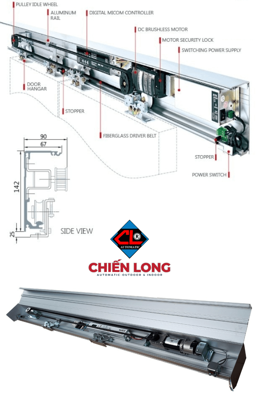 - Motor truyền động đảo chiều tốc độ mở 100 - 1100mm/s/cánh, điều chỉnh tốc độ và các chức năng bằng LED hiện thị, nguồn điện 220VAC.